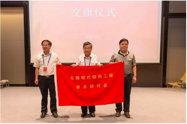 颁奖典礼最后,举行了全国现代结构工程学术研讨会会旗交接仪式,会旗由本届会议承办单位天津大学建筑设计规划研究总院常务副院长于敬海移交至下一届承办单位大元建业集团股份有限公司董事长郝书明手中。郝书明代表大元建业集团股份有限公司承诺将成功办好第十八届全国现代结构工程学术研讨会,并欢迎全国的钢构同仁相聚沧州,相聚2018。